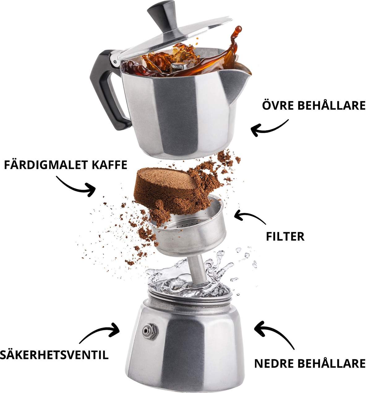 Bryggmetoden är välkänd men kan kräva övning och lite tålamod. Vad som är säkert är att metoden alltid ger lust till mer och att du kan se hela processen med bryggare och spis som en konst. Tekniskt sett brygger en mokabryggare inte en espresso, då den använder ett lägre tryck på 1-2 bar, till skillnad från en espressomaskin som använder minst 9 bar. Trots detta är kaffet från en mokabryggare otroligt starkt och smakrikt. Vissa bryggare kan till och med skapa lite crema, precis som en riktig espressomaskin. Om ditt mål med mokabryggaren är att brygga cafe latte eller cappuccino kommer du bli nöjd med resultatet. Önskar du däremot en shot tjock, krämig espresso ska du använda en riktig espressomaskin.
