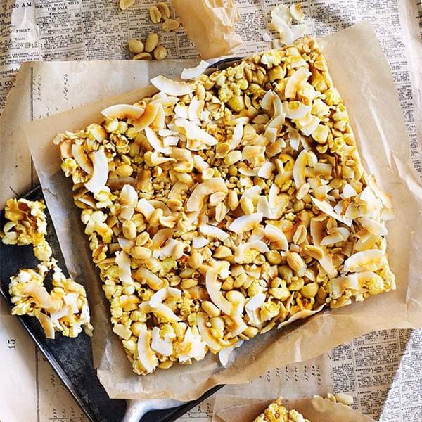 Sekoita popcorn, pähkinät ja kookoshiutaleet keskikokoiseen kulhoon. Laita hunaja paistinpannulle ja kuumenna keskilämmöllä. Alenna lämpöä ja anna hunajan poreilla noin 5 minuuttia tai kunnes se alkaa karamellisoitua. (Pidä silmällä, hunaja palaa helposti, kun se alkaa karamellisoitua.)