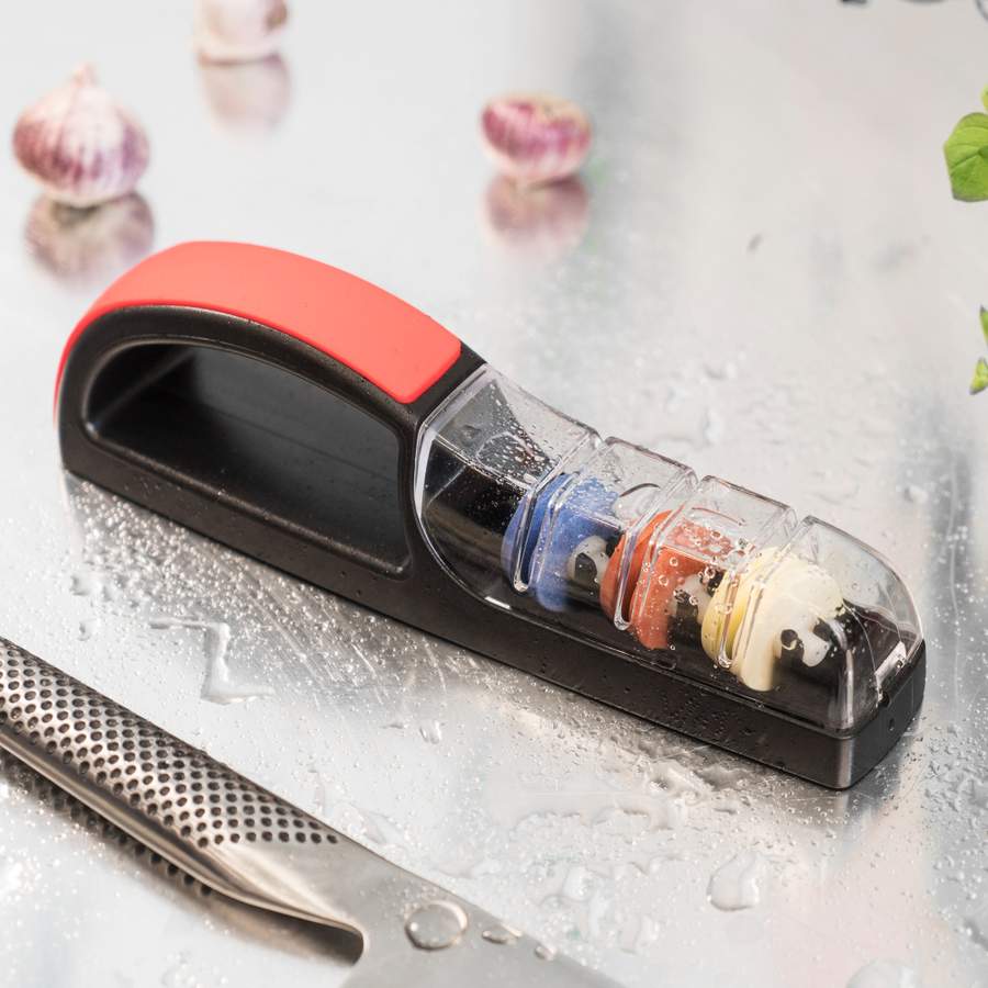 Keraaminen teroittaja / posliiniteroittaja – Hellävarainen veitselle eikä poista yhtä paljon terästä kuin timanttiteroittaja.
