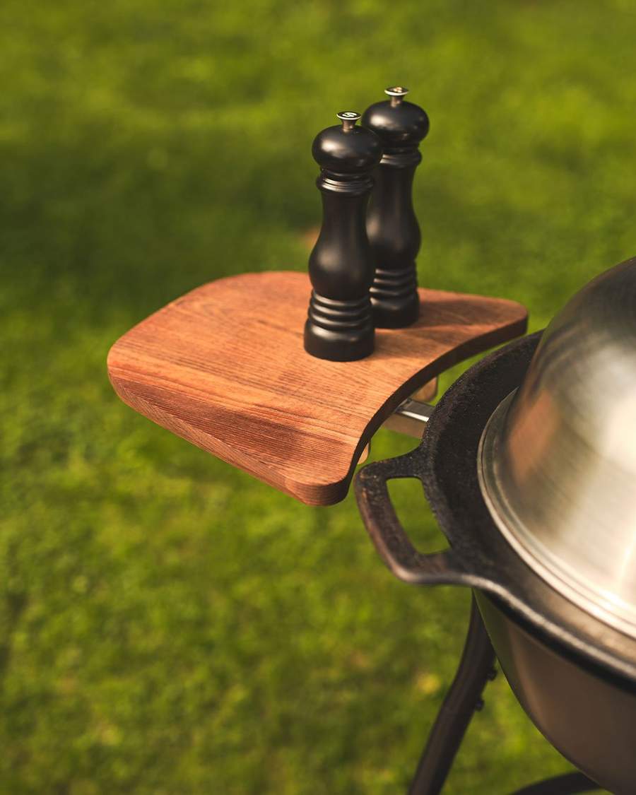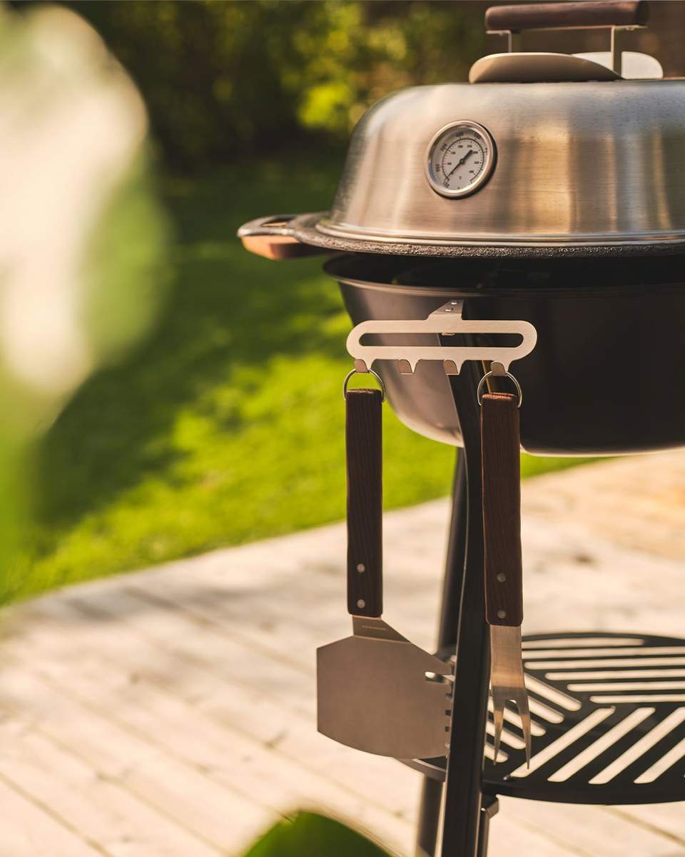 Valitse juuri sinulle sopiva setti. Jokainen setti sisältää kuumavalssatusta teräksestä valmistetun paistopannun, emaloidun kaasupolttimen, tukevan metallijalustan tuulensuojalla sekä kätevän hyllyn säilytykseen. Kaasupolttimen säätönupit syttyvät yhdellä kädellä ja kahta tai kolmea kaasurengasta voidaan säätää erikseen – näin pannulle saadaan erilaisia lämpöalueita. Työvälineet on valmistettu ruostumattomasta teräksestä ja niissä on FSC-sertifioidusta savustetusta saarnesta tehdyt kahvat – kestävä, kovapintainen ja kaunis puulaji, joka on lämpökäsitelty pitkäikäisyyden takaamiseksi. Hemmottele itseäsi tai ilahduta läheistä, joka arvostaa hyvää ruokaa luonnon helmassa, meren äärellä tai omassa puutarhassa.