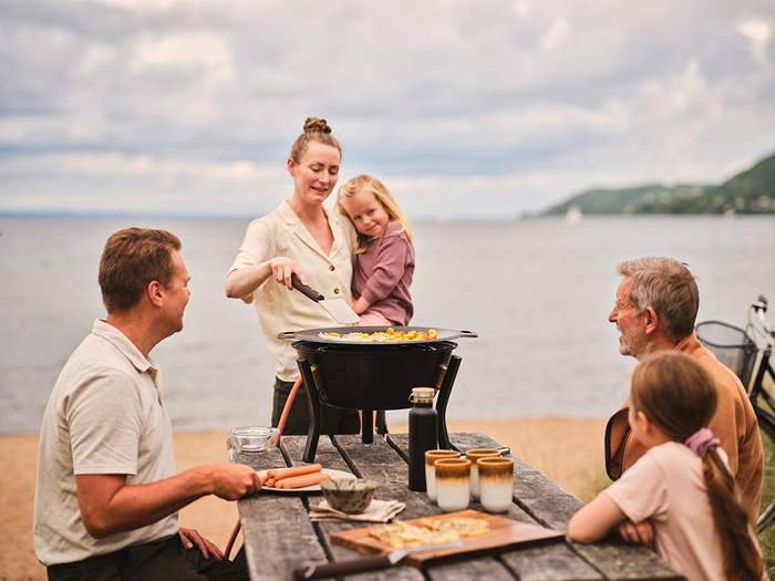 Picknick-malli on täydellinen pöydälle sijoitettavaksi tai retkelle mukaan otettavaksi. Settiin kuuluu Ø48 cm paistopannu. Kaasupolttimessa on kaksi portaattomasti säädettävää säädintä, joilla voit säätää kahden kaasurenkaan lämpötilaa toisistaan riippumatta. Setti on myös yhteensopiva muiden pienten ja keskikokoisten paistopannujemme ja pannujemme kanssa. Jalusta ja tuulensuoja ovat mustaksi maalattua terästä.
