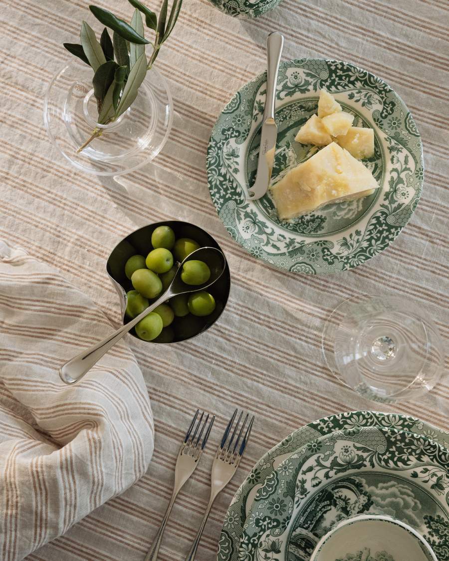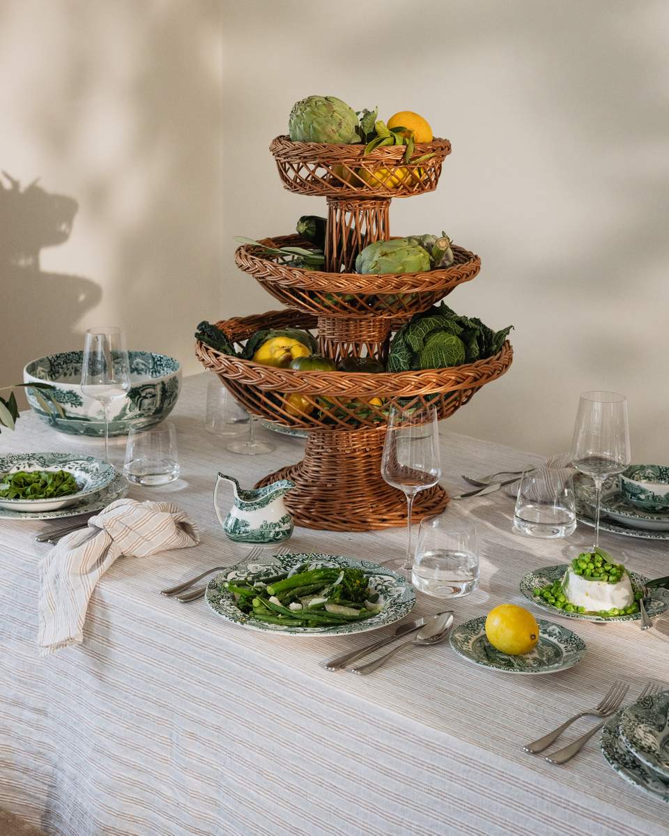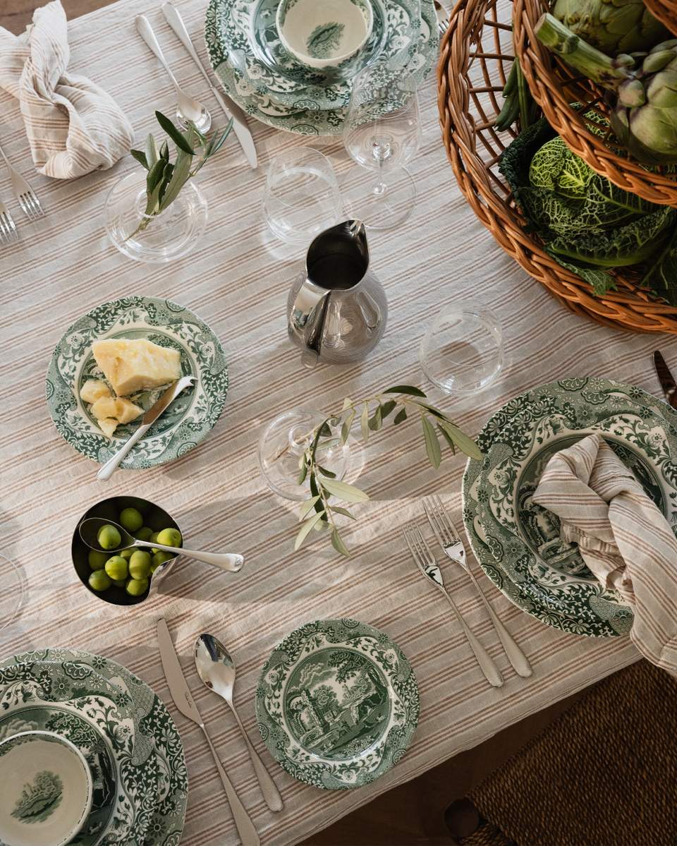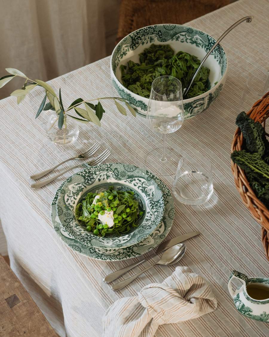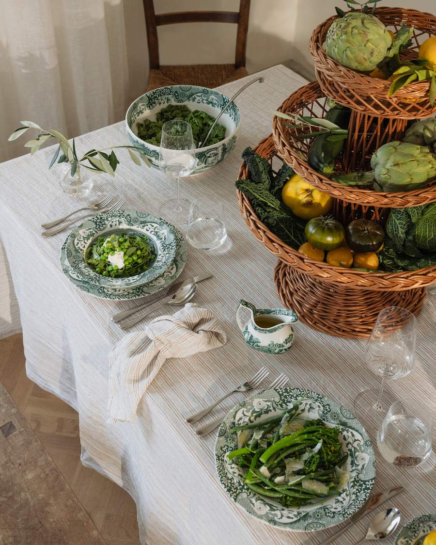 Aloita jonkinlaisesta teemasta tai ideasta kattaukselle. Se voi olla väri, ruokalaji, erityinen maljakko tai kuva, jonka olet nähnyt – jokin lähtökohta, joka herättää ideoita. Tässä tapauksessa käytimme kauniisti kuvioitua Spoden posliinia vihreissä sävyissä italialaisin vivahtein. Lisäksi kevät on tulossa, joten katimme pöydän italialaista kevätillallista varten vihreissä sävyissä.